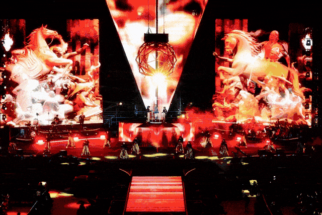 走进武吉加里尔国家体育场,仿佛置身于一个梦幻的音乐宇宙。伴随着《黄金甲》的激昂旋律,独特的球形屏瞬间成为全场焦点,它如同能量汇聚的宝珠,呈现出中国传统阵象变化,气势磅礴,为歌曲增添了浓厚的历史氛围和视觉冲击力。