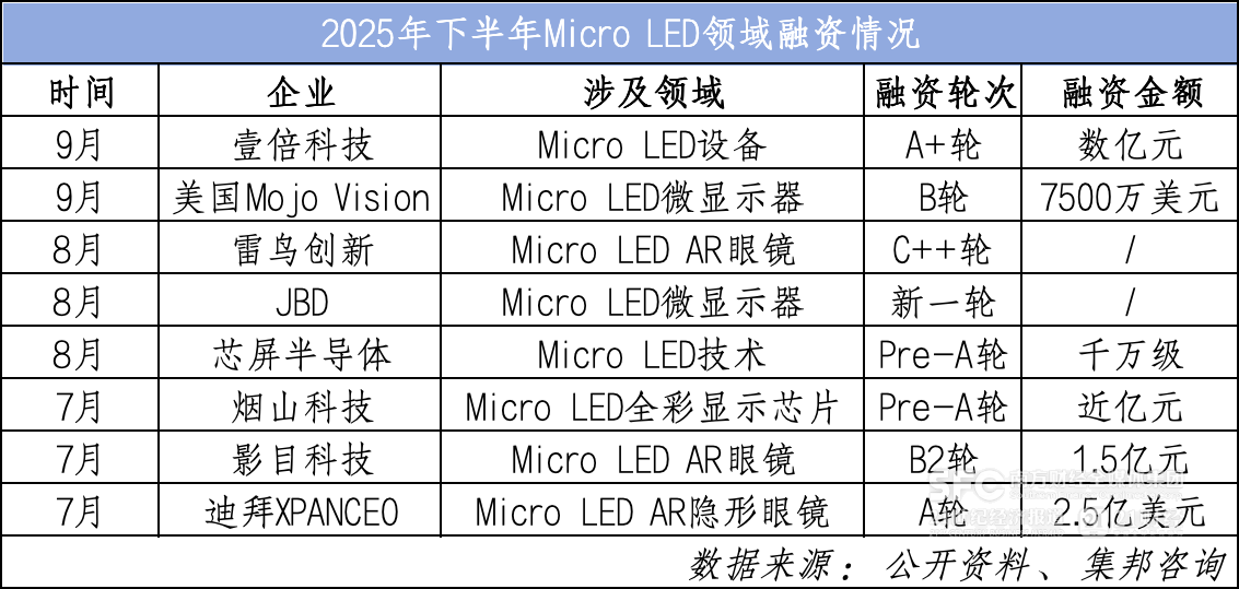 资本市场对Micro LED技术的热情也持续高涨,多家企业获得大额融资。今年10月,上海显耀显示(JBD)宣布已完成一笔超十亿元人民币的B2轮融资,资金主要用于加速Micro LED技术的创新与产品迭代,这一金额刷新了全球Micro LED微显示领域的单笔融资纪录。