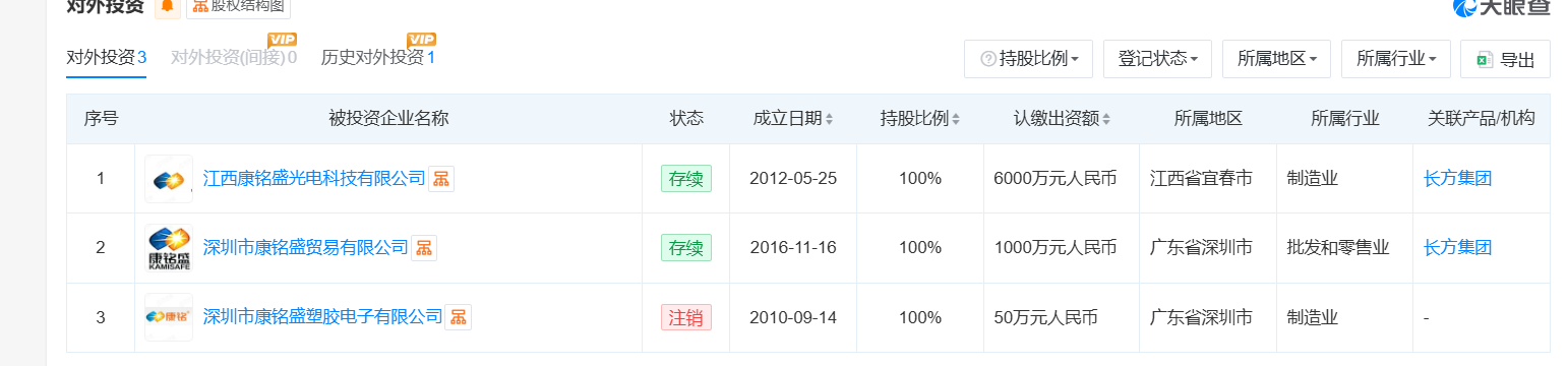 天眼查显示,长方集团康铭盛(深圳)科技有限公司(以下简称“康铭盛”)成立于2004年3月,注册资本10747.6万元,法定代表人吴涛祥,经营范围含新能源、新材料、塑胶制品、五金制品、电器、电子产品、室内外照明产品等。该公司对外有2家投资企业。