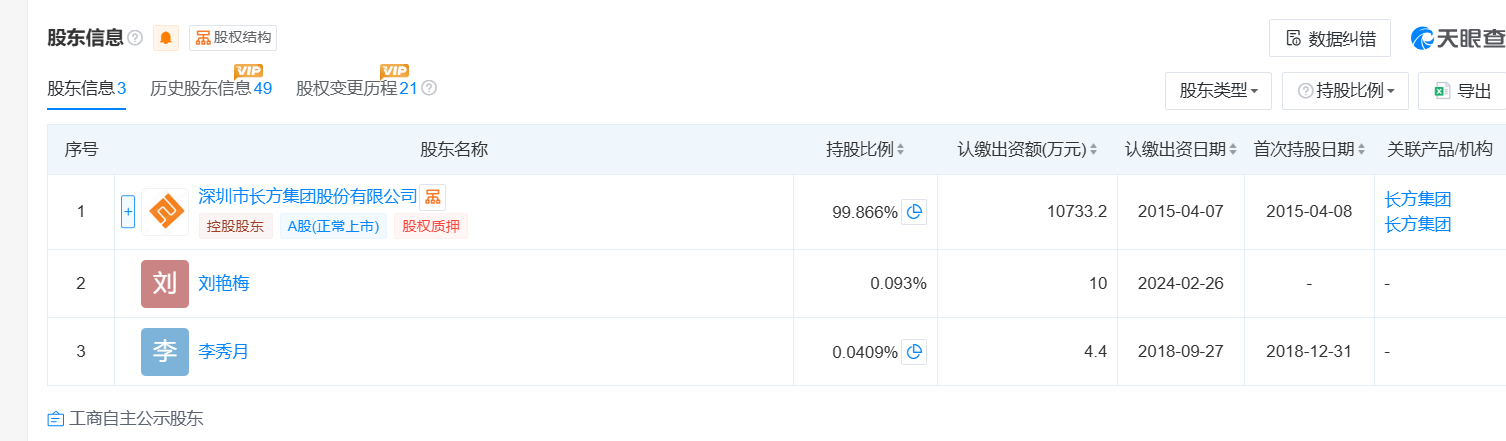 该公司由深圳市长方集团股份有限公司持股99.866%、刘艳梅持股0.093%、李秀月持股0.0409%。