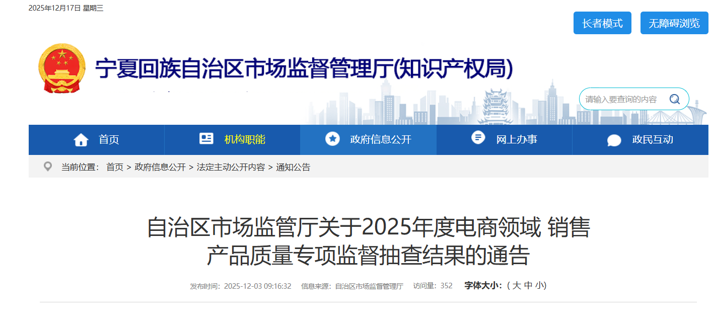 乐居财经 李兰 前不久,宁夏回族自治区市场监管厅发布关于2025年度电商领域销售产品质量专项监督抽查结果的通告。其中家用电器及电器附件抽检25批次,不合格5批次,不合格发现率20%。