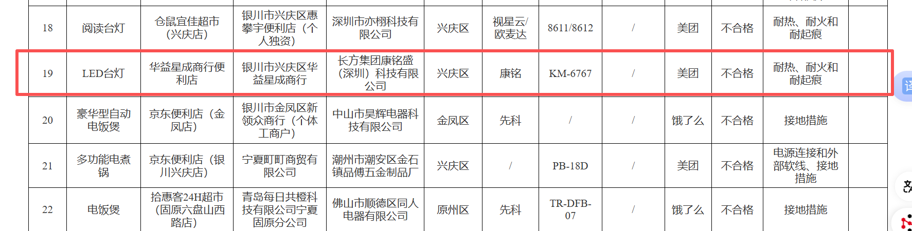 标称生产者“长方集团康铭盛(深圳)科技有限公司”生产的LED台灯(样品规格型号:KM-6767)产品抽检不合格,不合格项目为耐热、耐火和耐起痕。