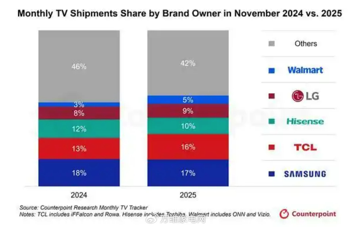 在以TCL为首的国产品牌全力推动显示技术迭代、引领画质升级的同时,全球电视市场的竞争格局也在悄然发生“变数”——据市场调研机构Counterpoint报告显示,在2025年11月全球彩电出货量中,三星电视以17%的全球市场出货份额继续稳居榜首,但领先优势正持续收窄,已明显感受到来自TCL的强大市场冲击。