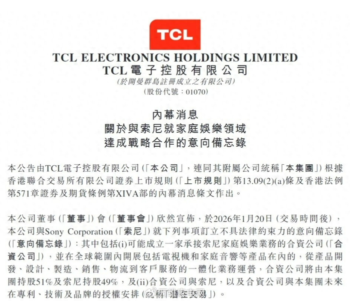 更劲爆的是最近一则TCL与索尼成立合资公司的新闻,更是引发行业震动。根据双方签署的意向备忘录,新成立的合资公司TCL持股51%,索尼持股49%,将索尼的“家庭娱乐业务”,包括电视机及家庭音响等产品。在万维君看来,此次TCL与索尼的重磅合作,或许会成为改写行业竞争规则的关键变量。