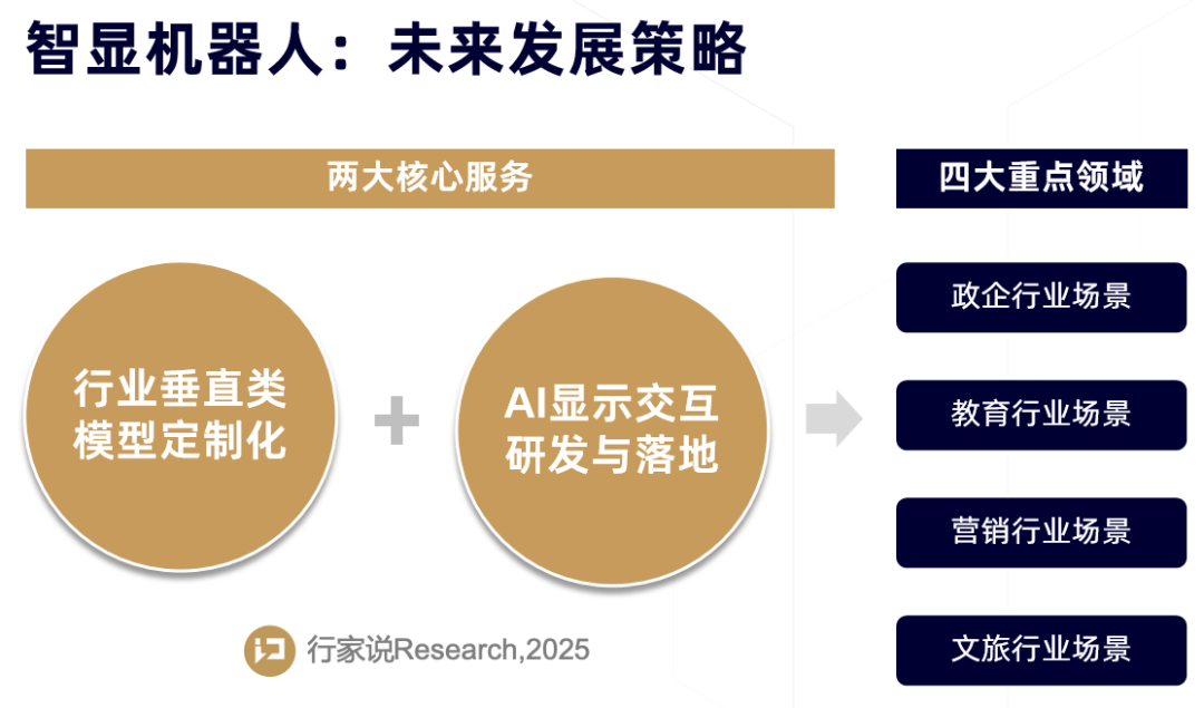 针对未来发力方向,智显机器人也确立了两大核心服务方向——“行业垂直类模型定制化”、“AI显示交互研发与落地”,以及四大重点领域——政企、教育、营销、文旅。